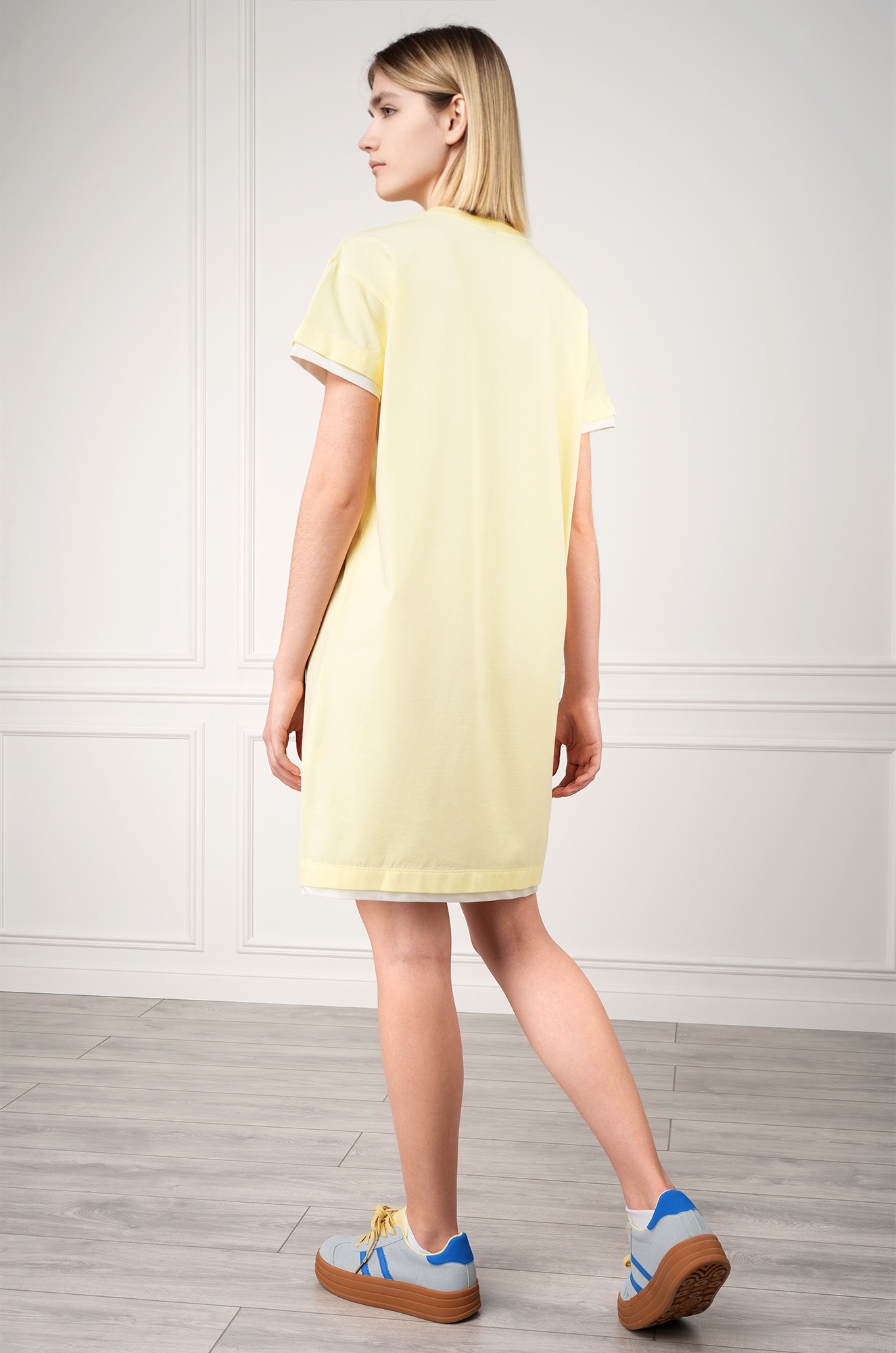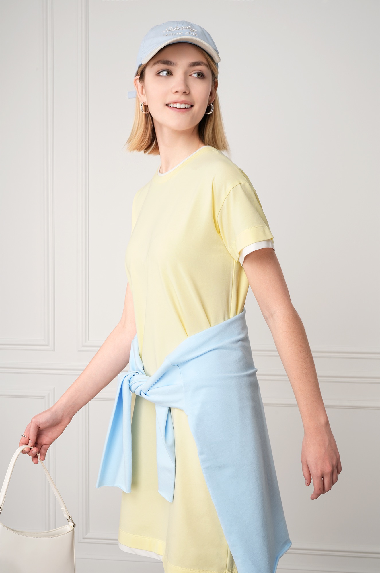 Женское платье-футболка — прекрасное решение для жаркого лета. Свободное платье с коротким рукавом выполнено из хлопка с добавлением эластана (95% хлопок, 5% эластан, плотность 180 г/м²), что делает его приятным к телу, эластичным и комфортным для повседневного ношения. Спортивное трикотажное платье прямого кроя создаёт красивый свободный силуэт.