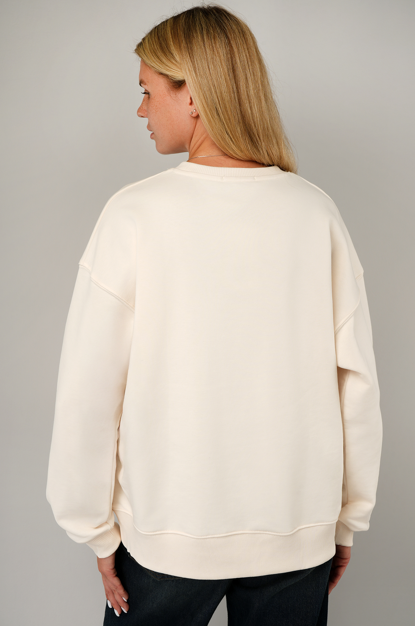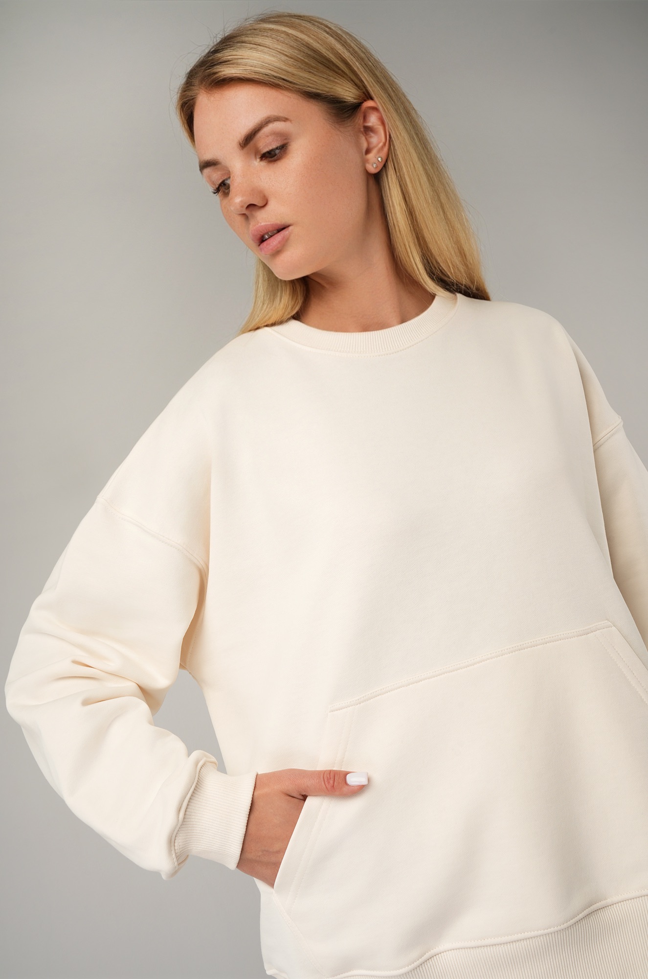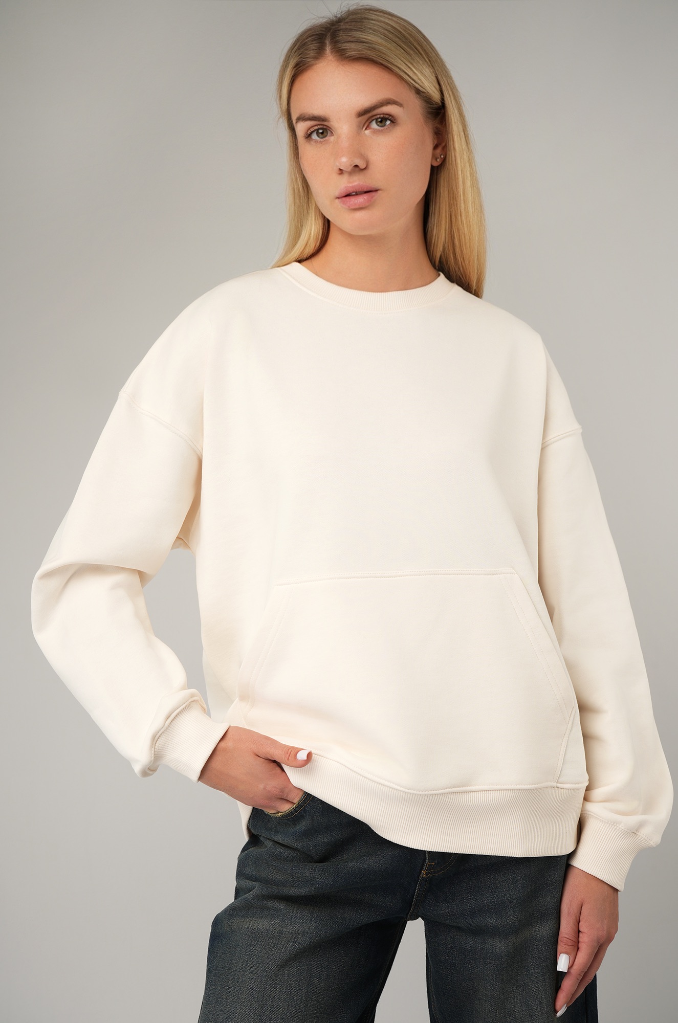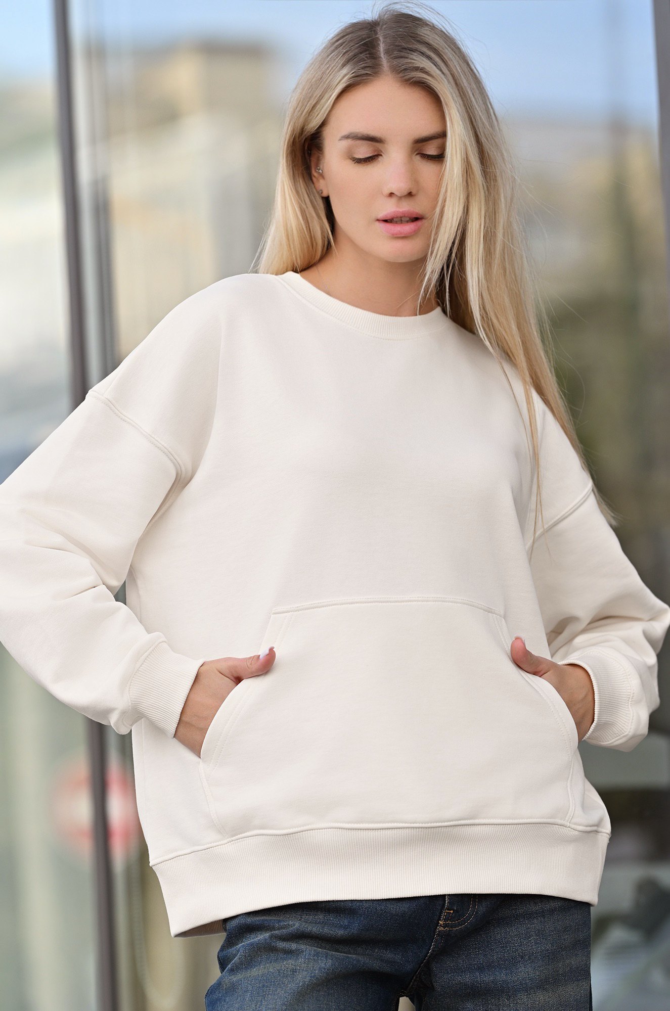 Свободный крой оверсайз со спущенным плечом создаёт расслабленный силуэт. Трикотажный демисезонный свитшот для женщин идеально подходит для домашнего отдыха, прогулок или встреч на свежем воздухе в осенний или весенний день.