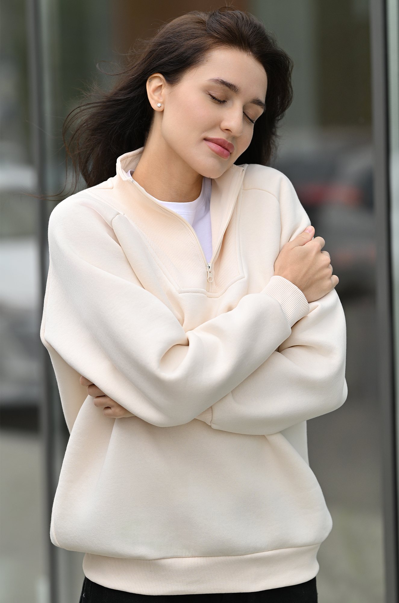 Женская толстовка оверсайз — стиль и комфорт в одном. Однотонный светло-бежевый свитшот на молнии выполнен из мягкого футера с начесом (60% хлопок, 40% полиэстер). Спортивная кофта с воротником на молнии согреет в прохладные дни.