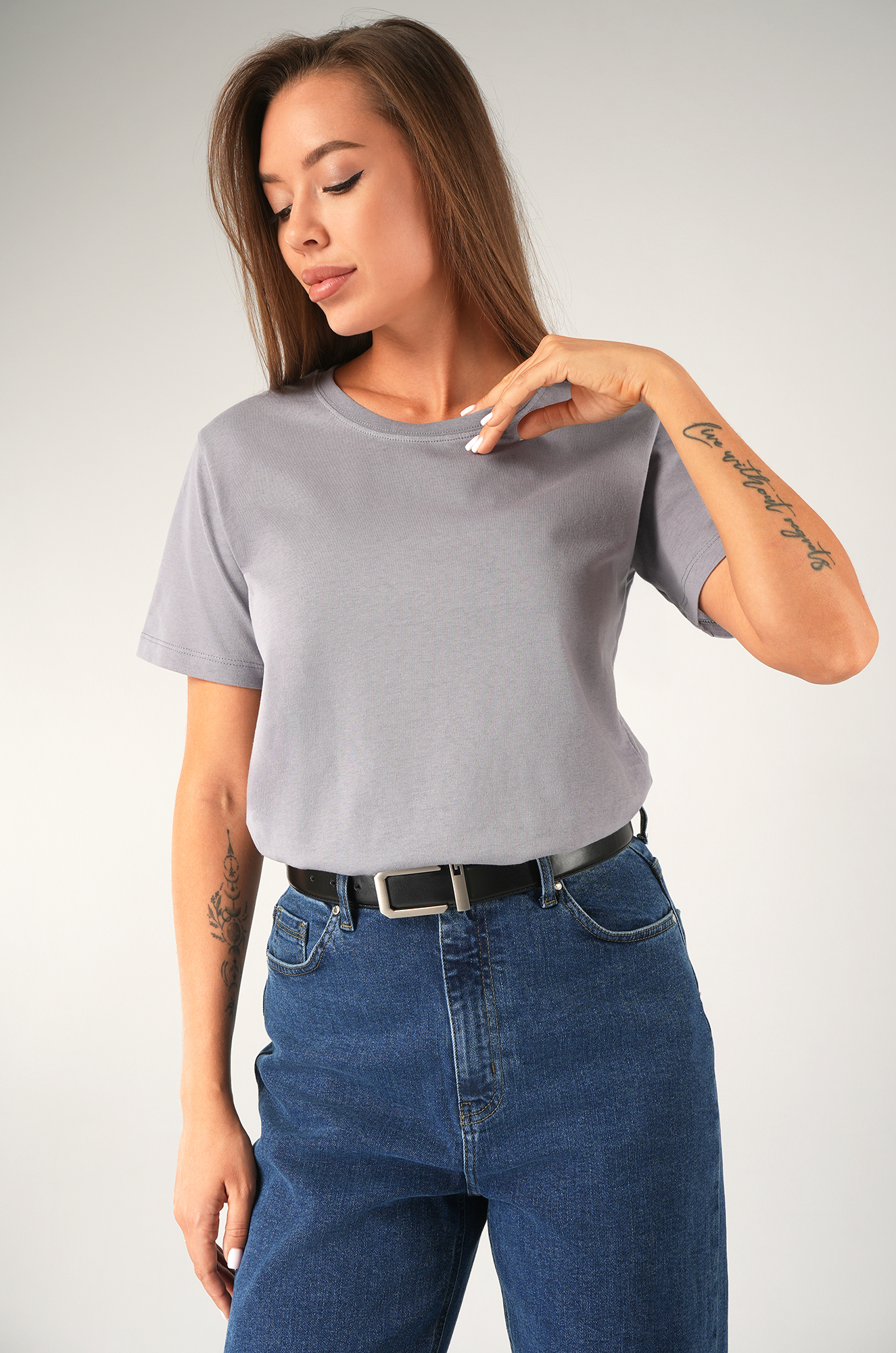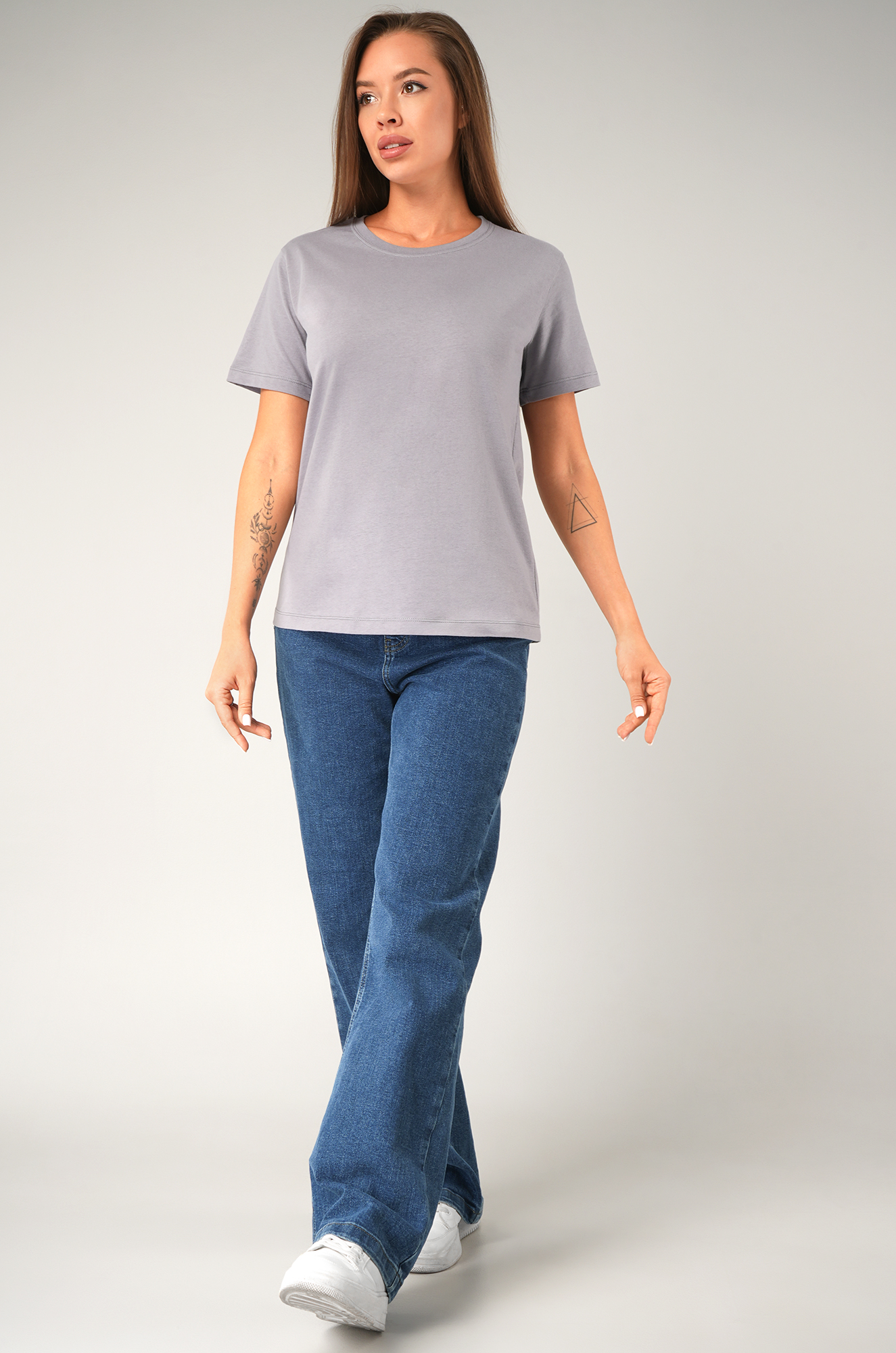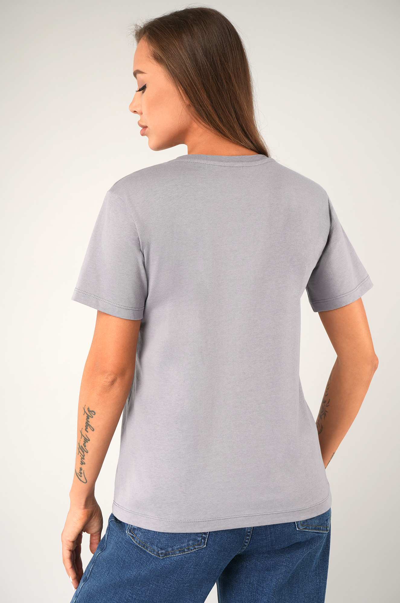 — серая футболка универсальна и легко сочетается с любыми элементами гардероба;
