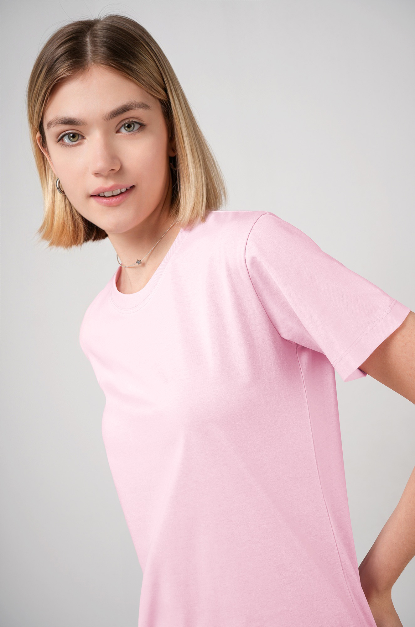 — розовая футболка добавляет мягкий акцент и делает образ более нежным;