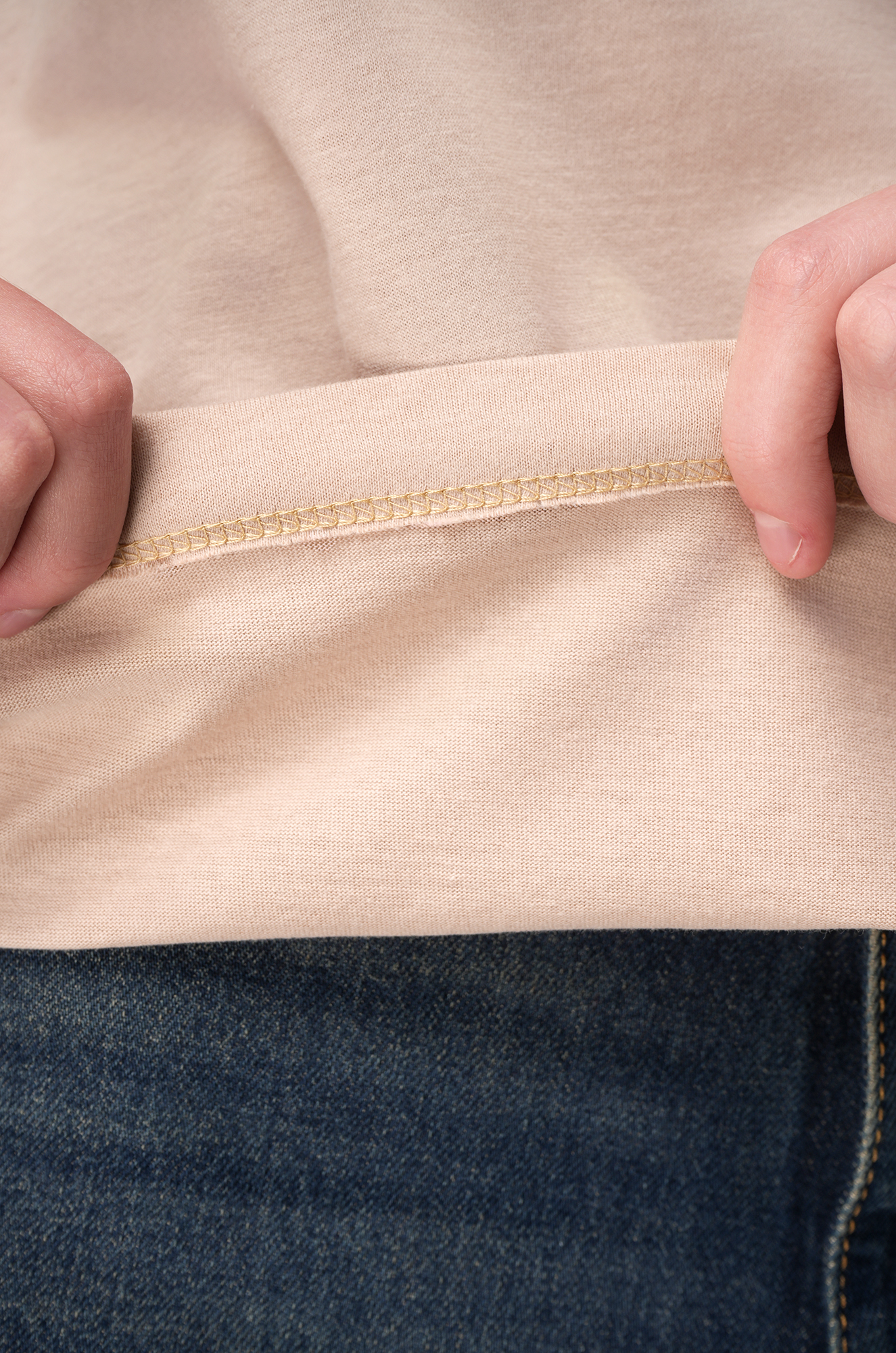 — бежевая футболка — классическая база, которая легко сочетается с любыми образами;
