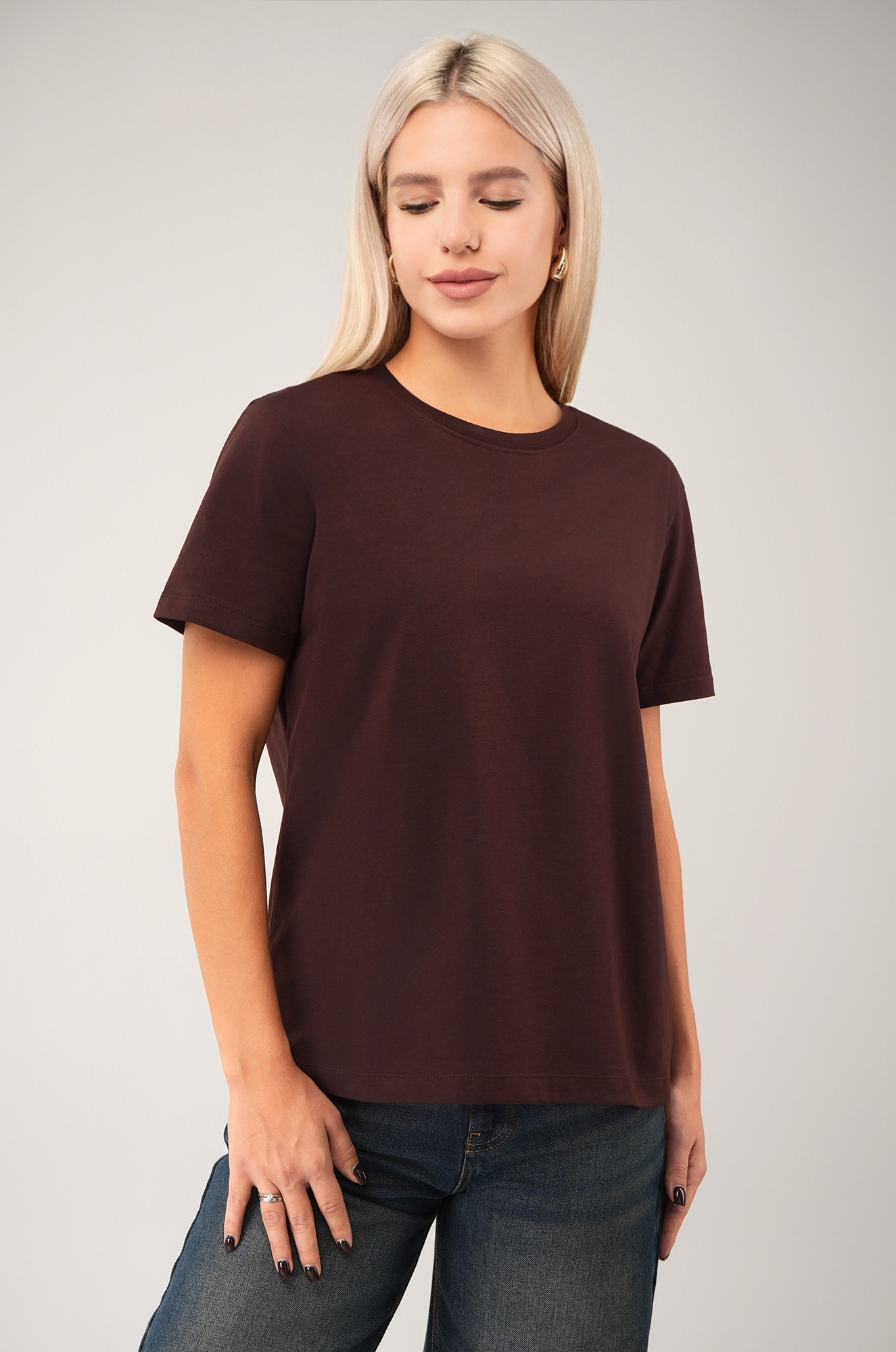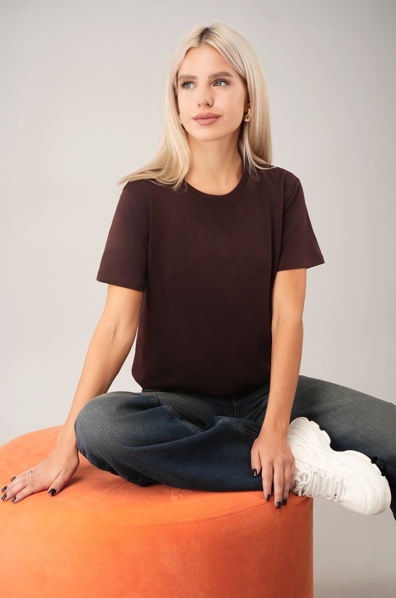 Трикотажная футболка шоколадного цвета станет стильной основой образов в стиле кэжуал.