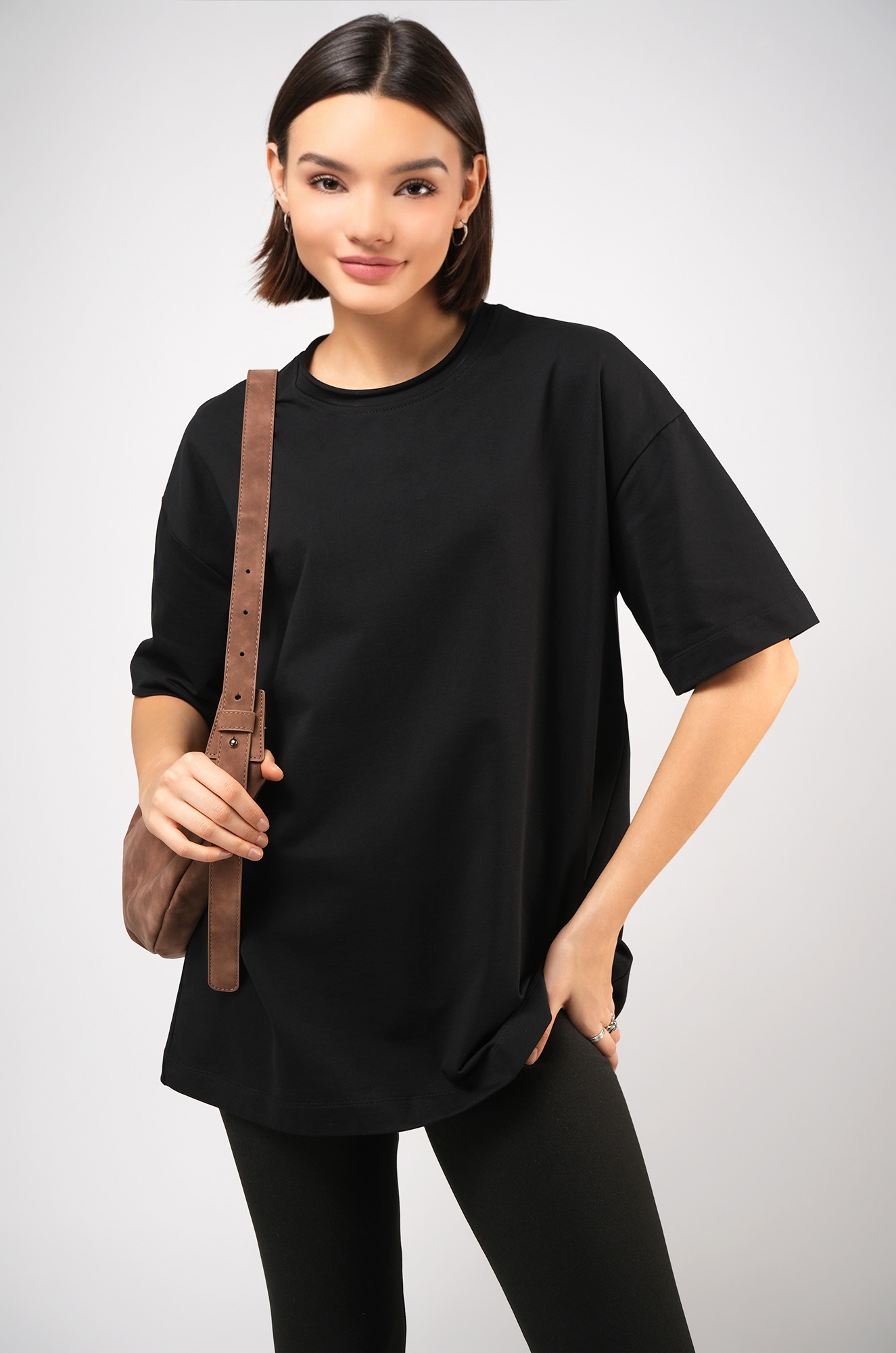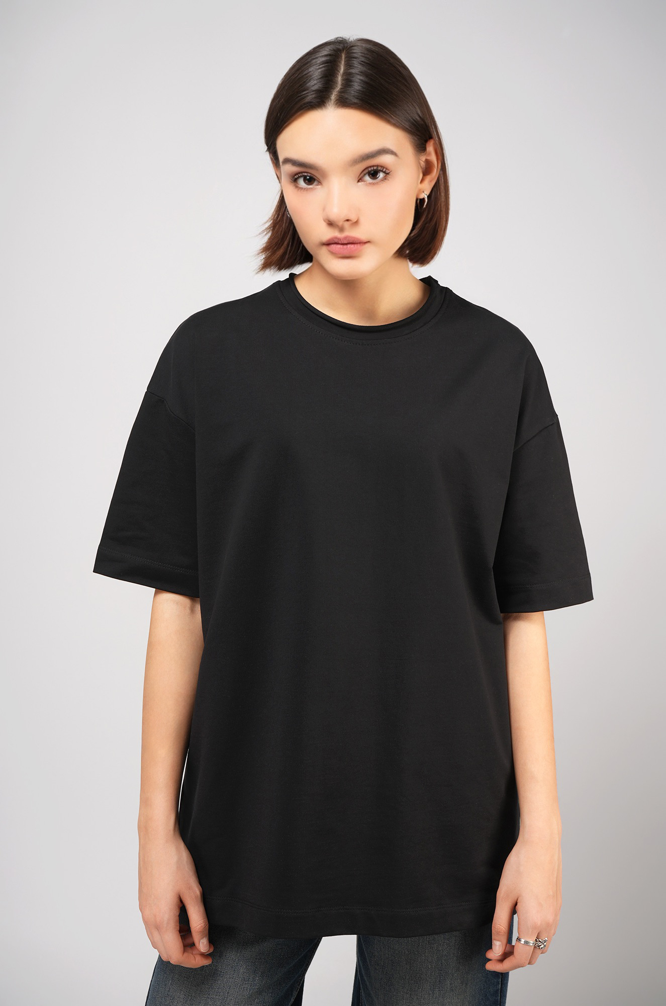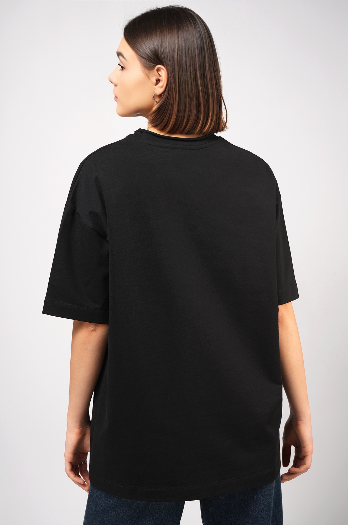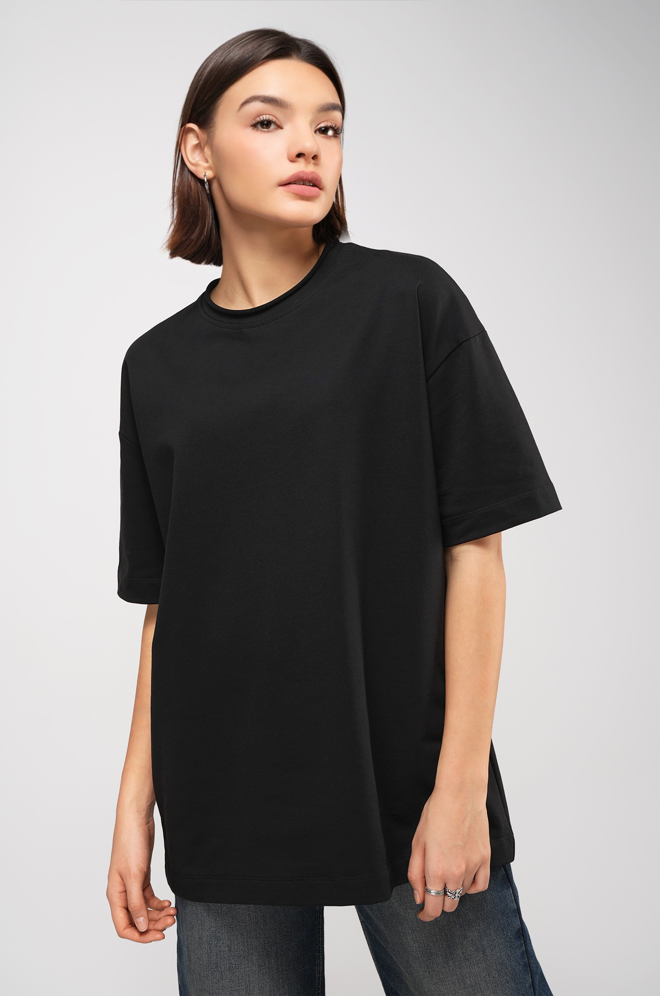 Женская футболка черного цвета выполнена в популярном стиле оверсайз. Её свободный крой со спущенным плечом создаёт расслабленный силуэт. Особый шарм трикотажной модели придает нарочито необработанный край горловины.