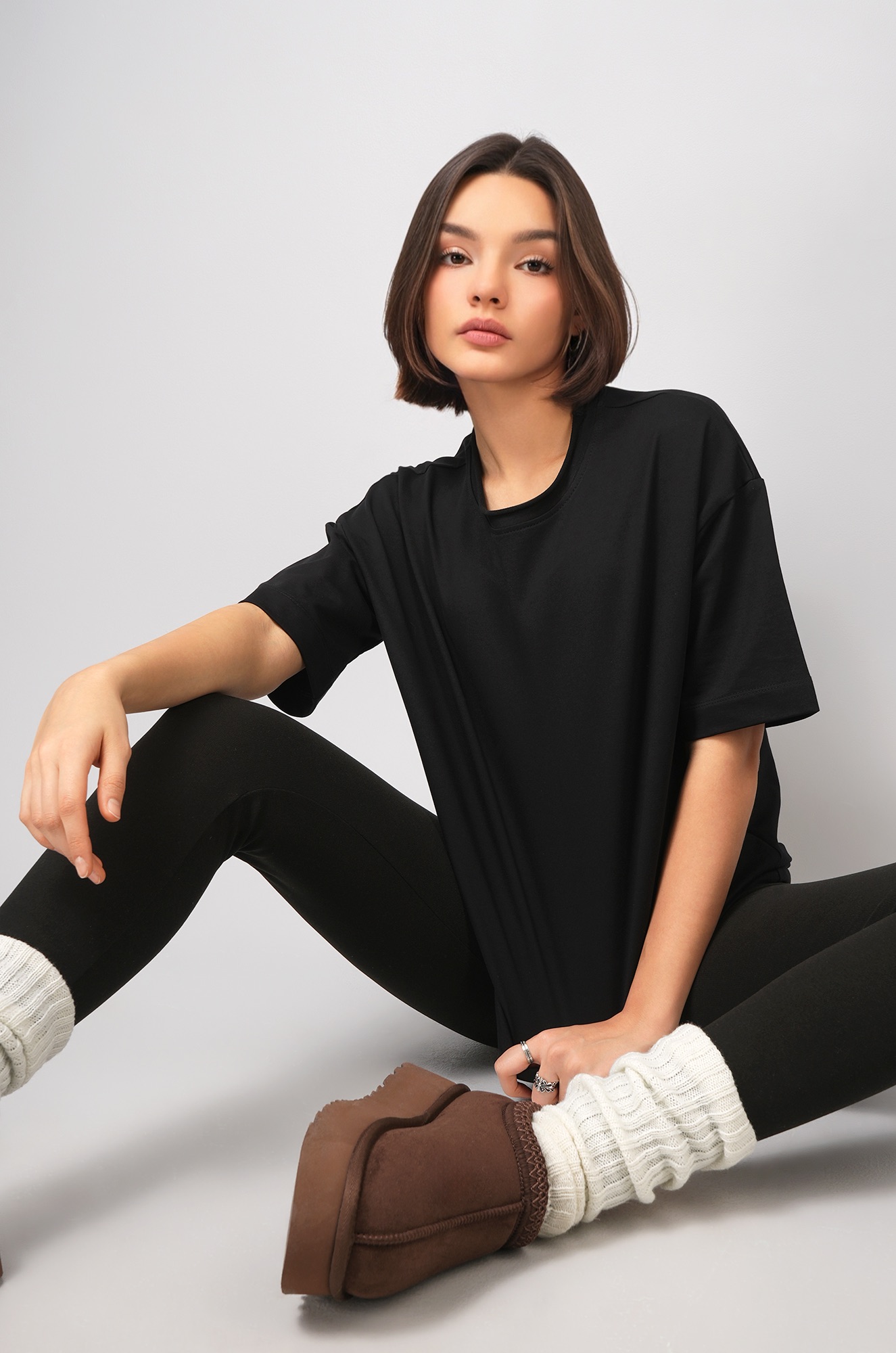 Универсальная черная футболка для женщин станет идеальным вариантом для дома, прогулок и для спорта.