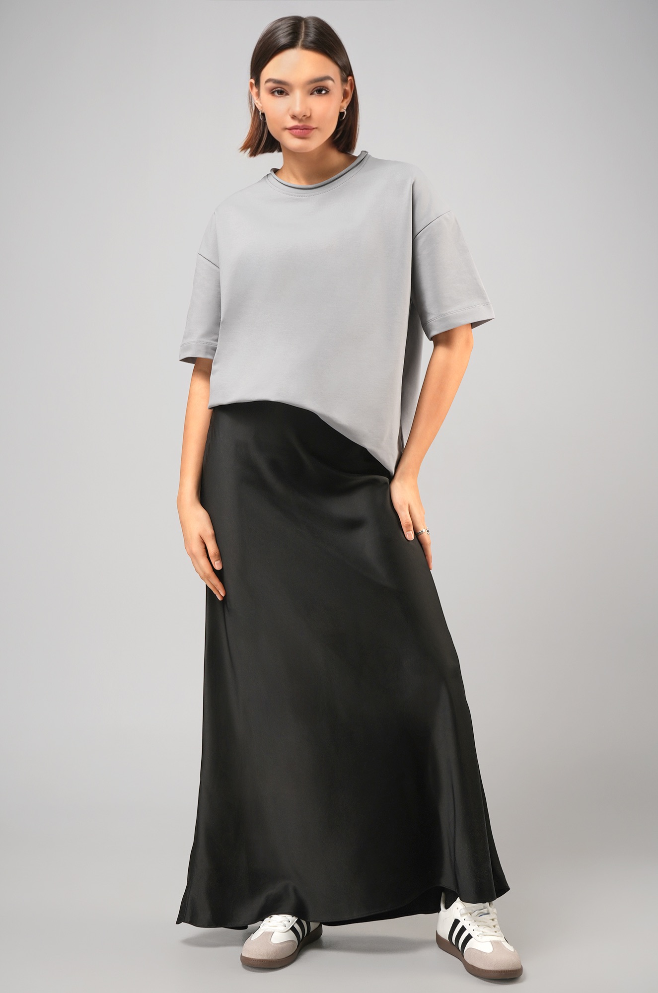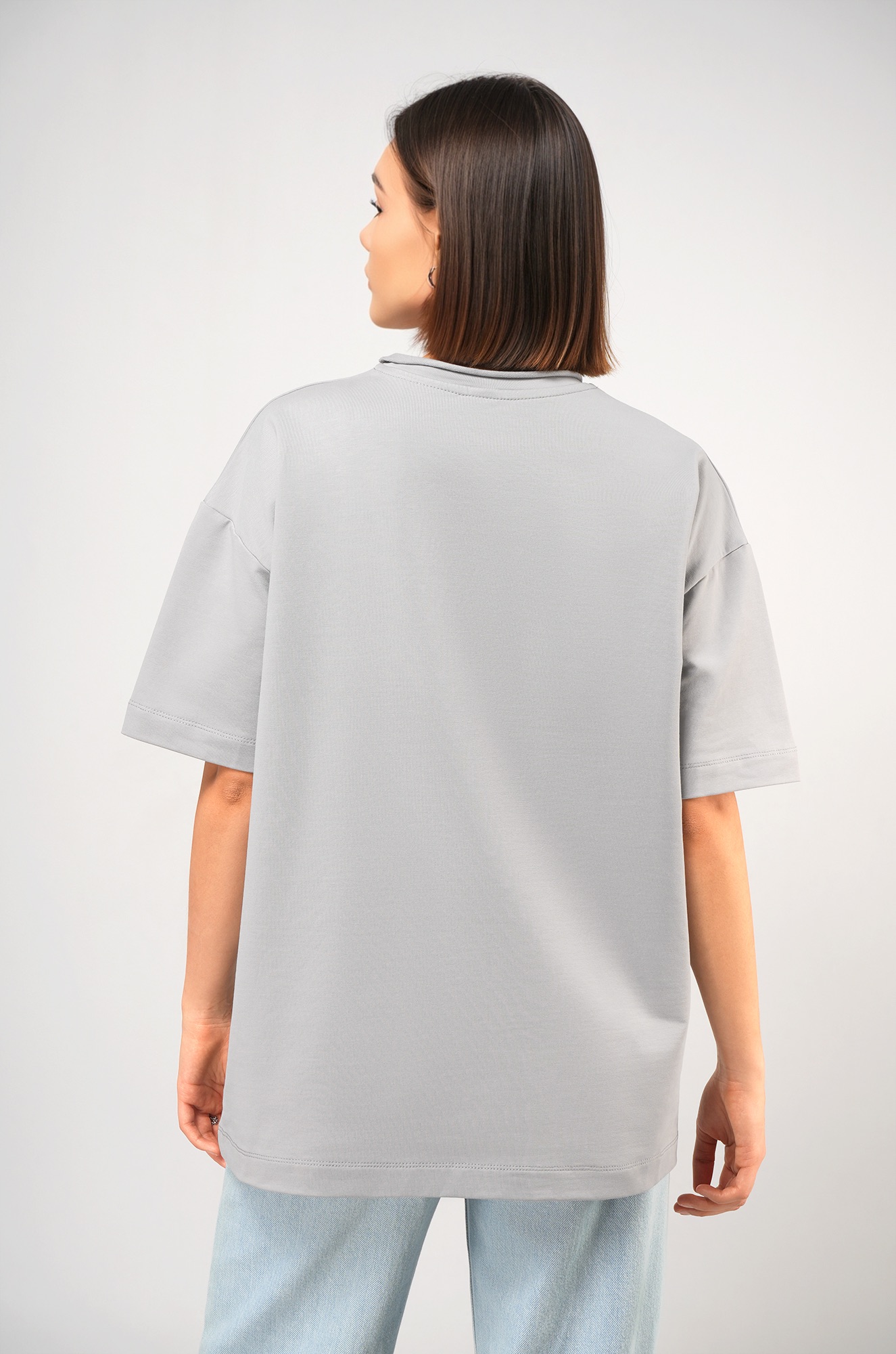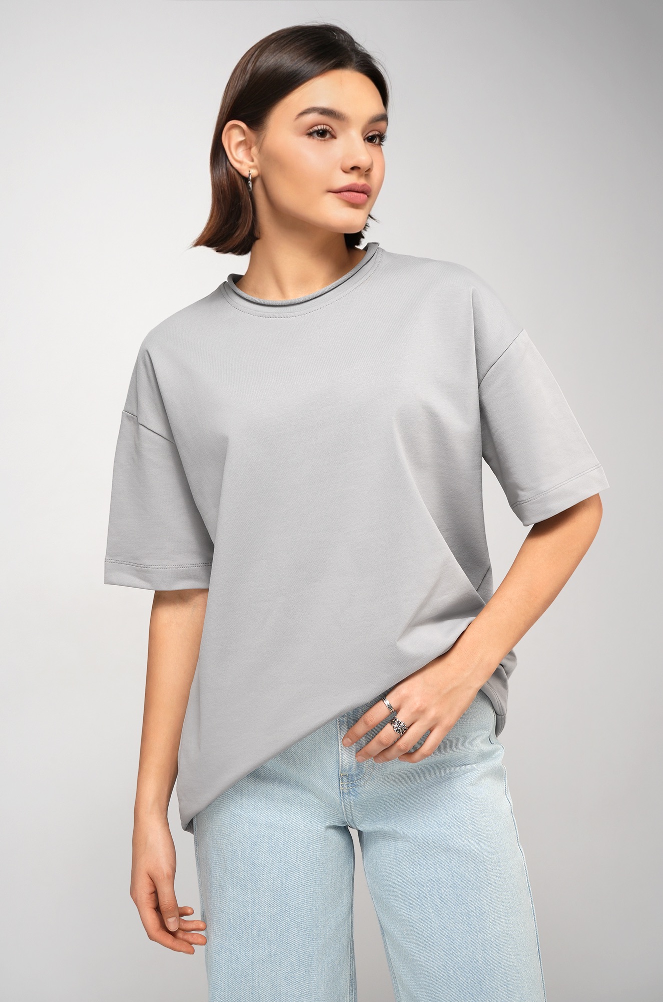 Женская футболка светло-серого цвета выполнена в популярном стиле оверсайз. Её свободный крой со спущенным плечом создаёт расслабленный силуэт. Особый шарм трикотажной модели придает нарочито необработанный край горловины.