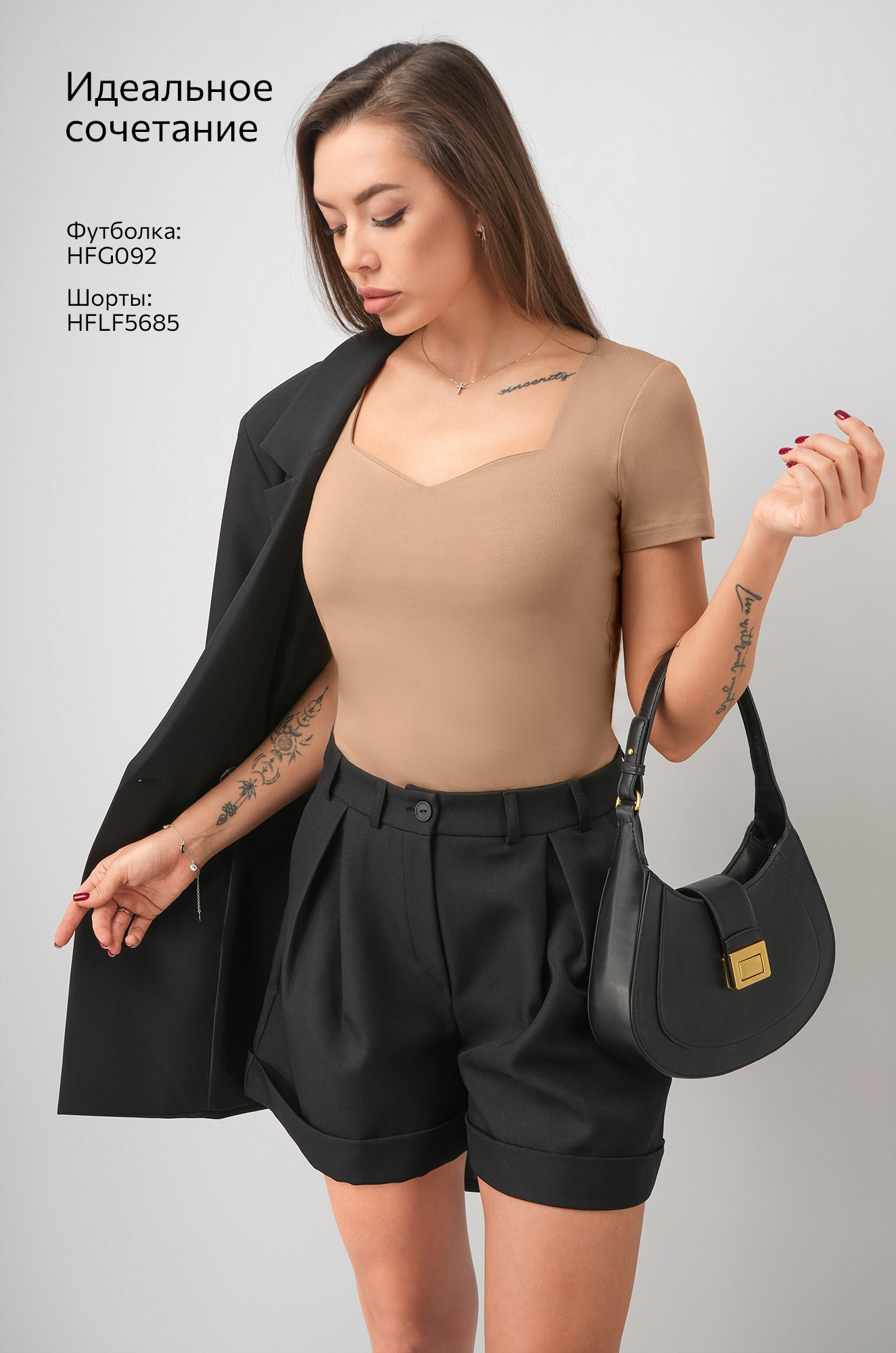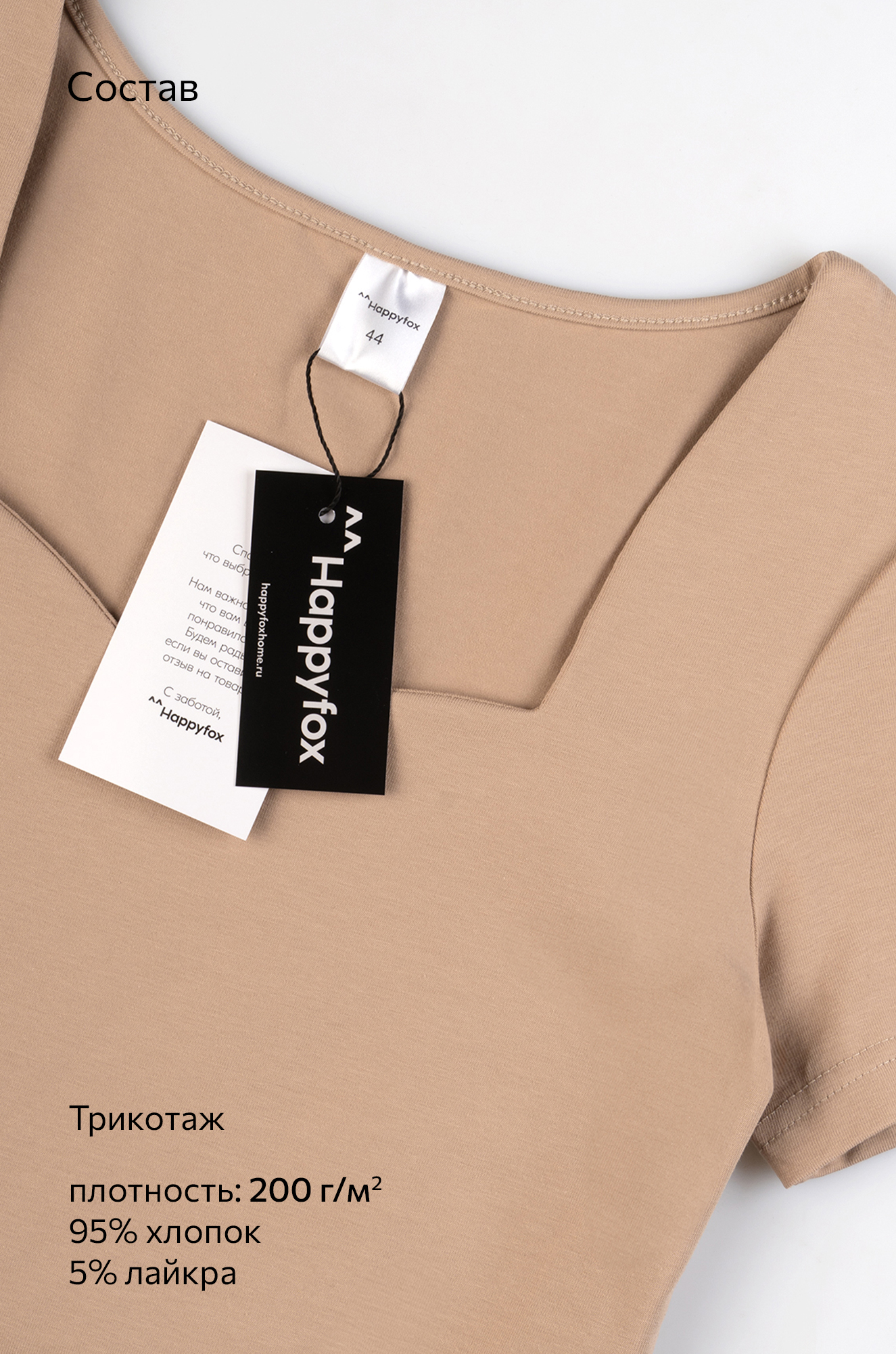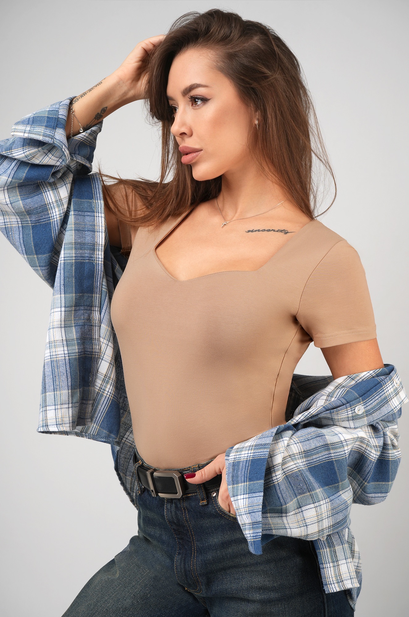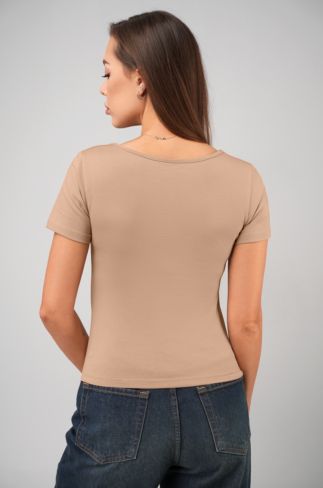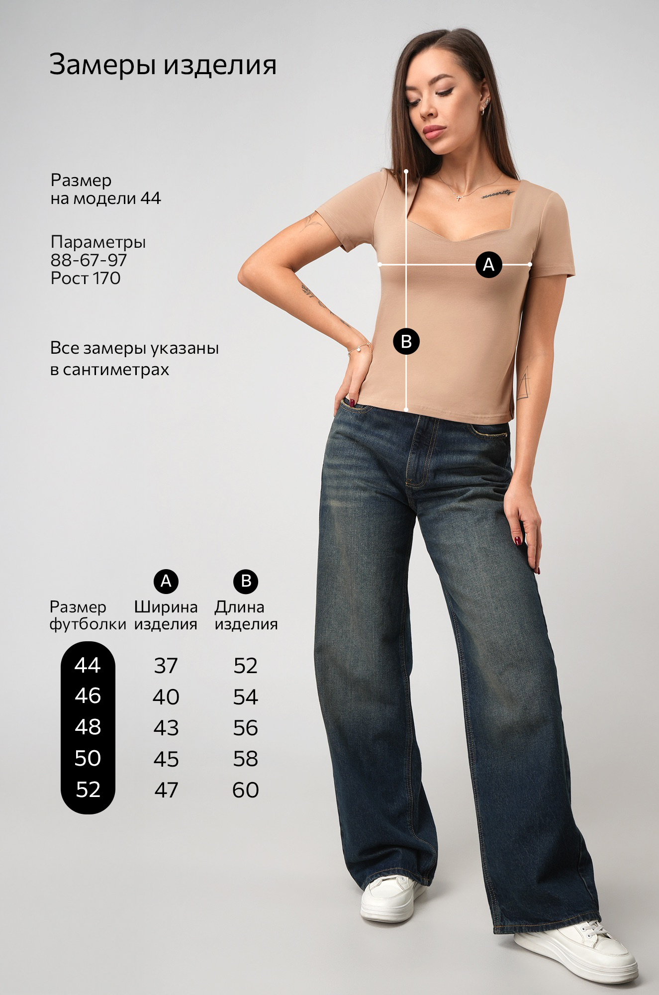 Элегантная женская футболка — лаконичная модель, которая сочетает минимализм и утонченность. Светло-бежевая футболка с квадратным вырезом каре подойдет для офиса, прогулок и вечерних мероприятий, создавая изящные образы.