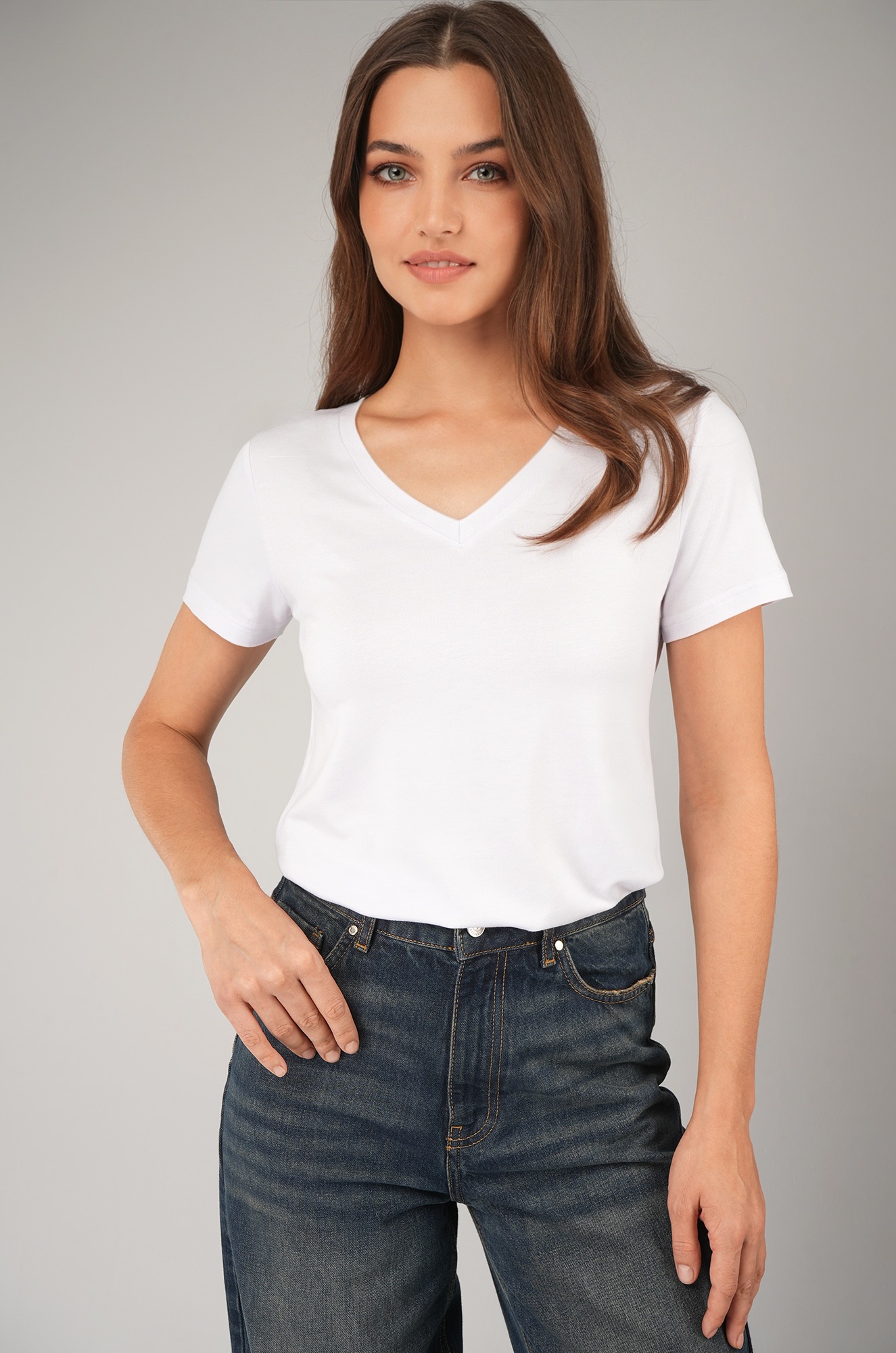 Базовая женская футболка из вискозы – настоящая находка для любителей приталенного силуэта. Модель с V-образным вырезом подчеркивает шею и зону декольте и выглядит очень женственно.