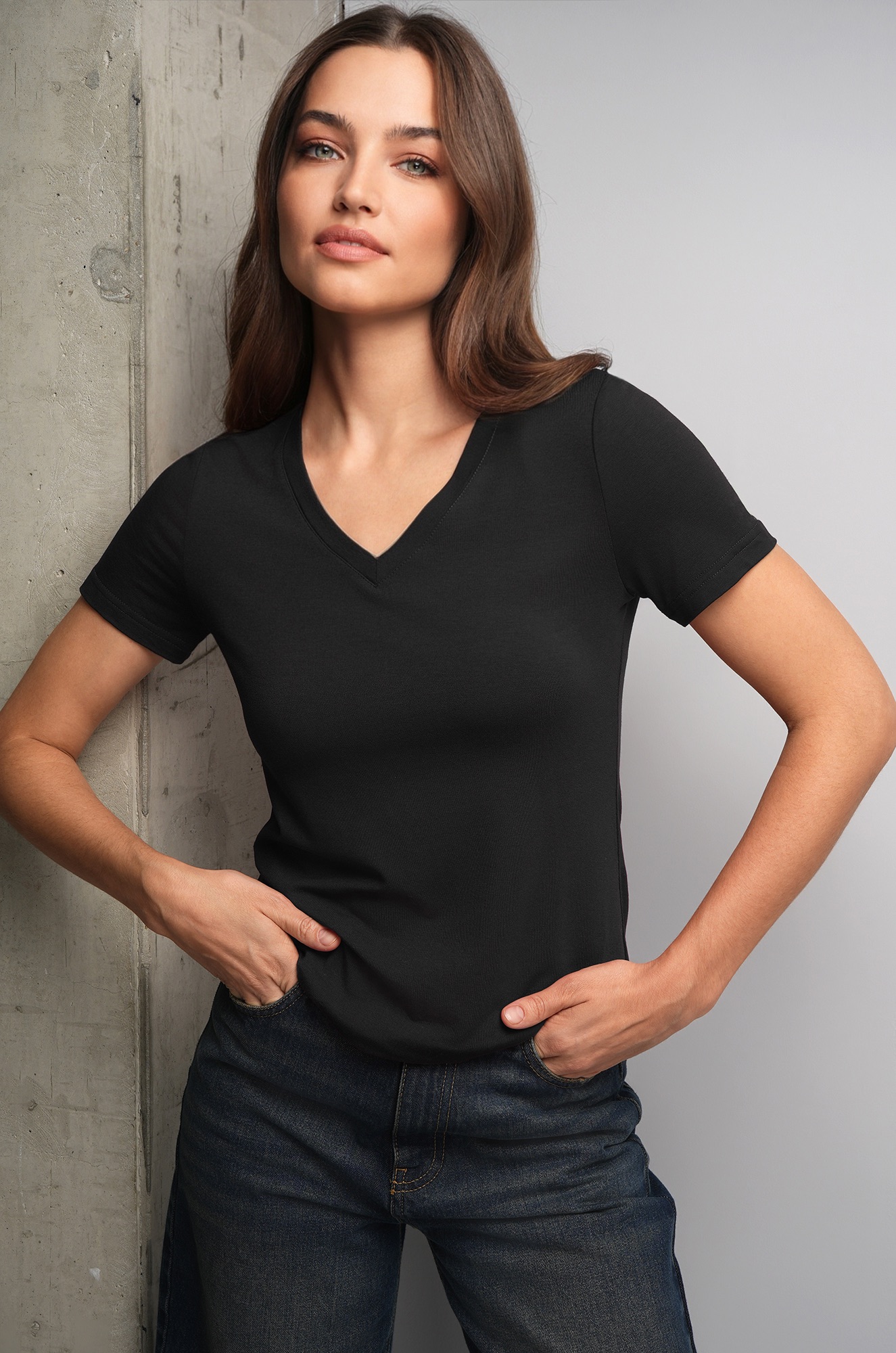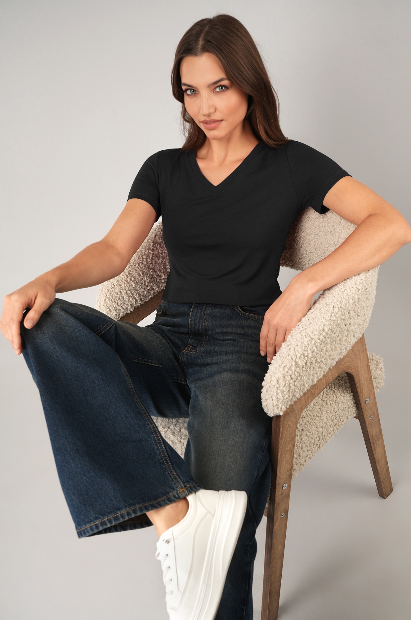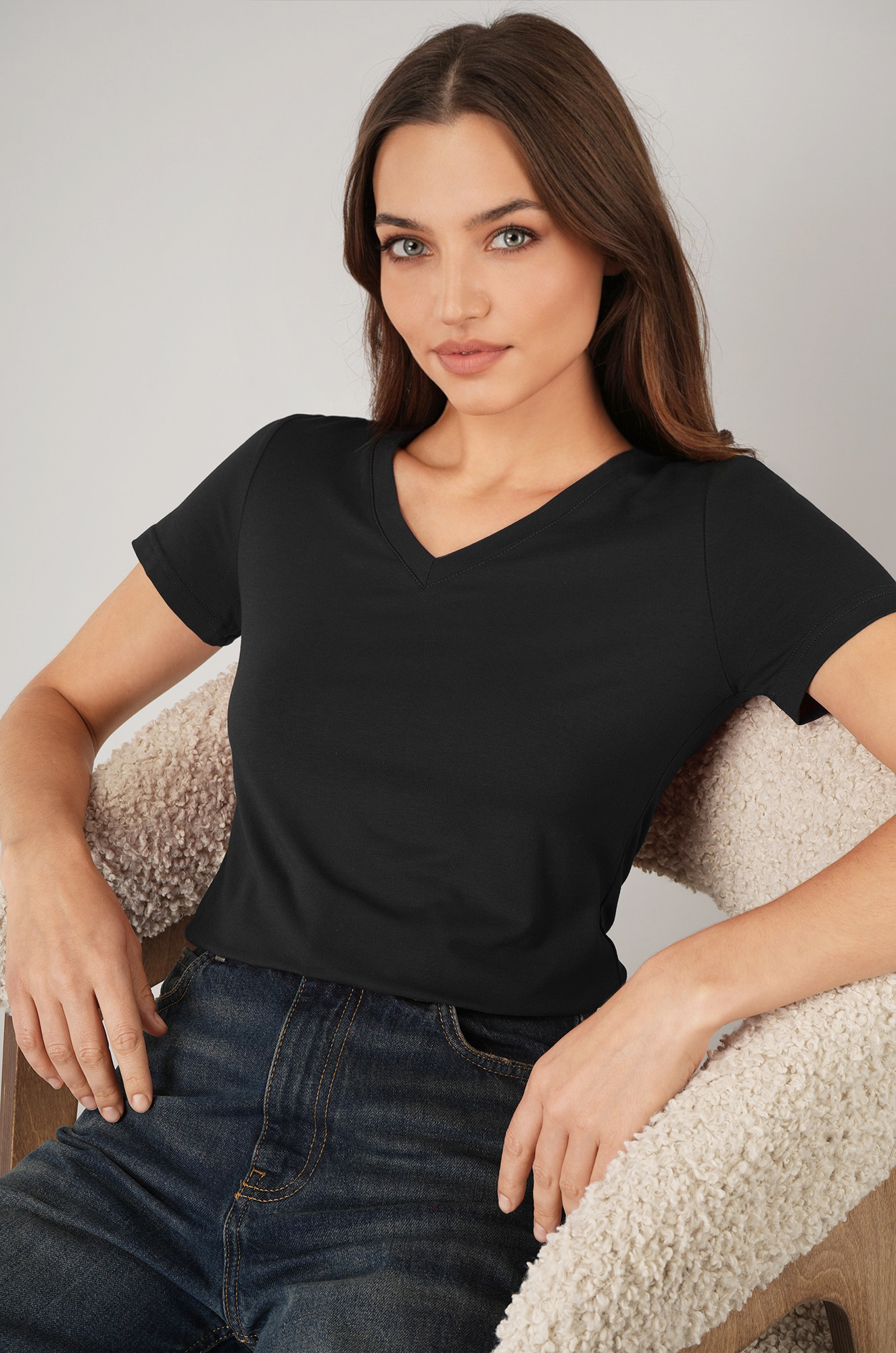 Базовая женская футболка из вискозы – настоящая находка для любителей приталенного силуэта. Модель с V-образным вырезом подчеркивает шею и зону декольте и выглядит очень женственно.