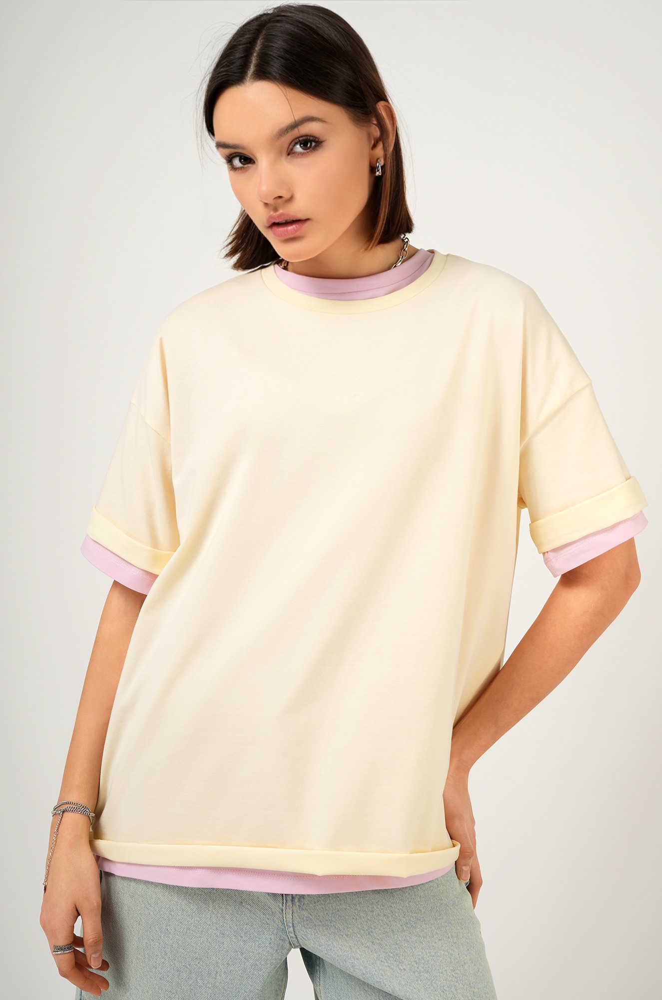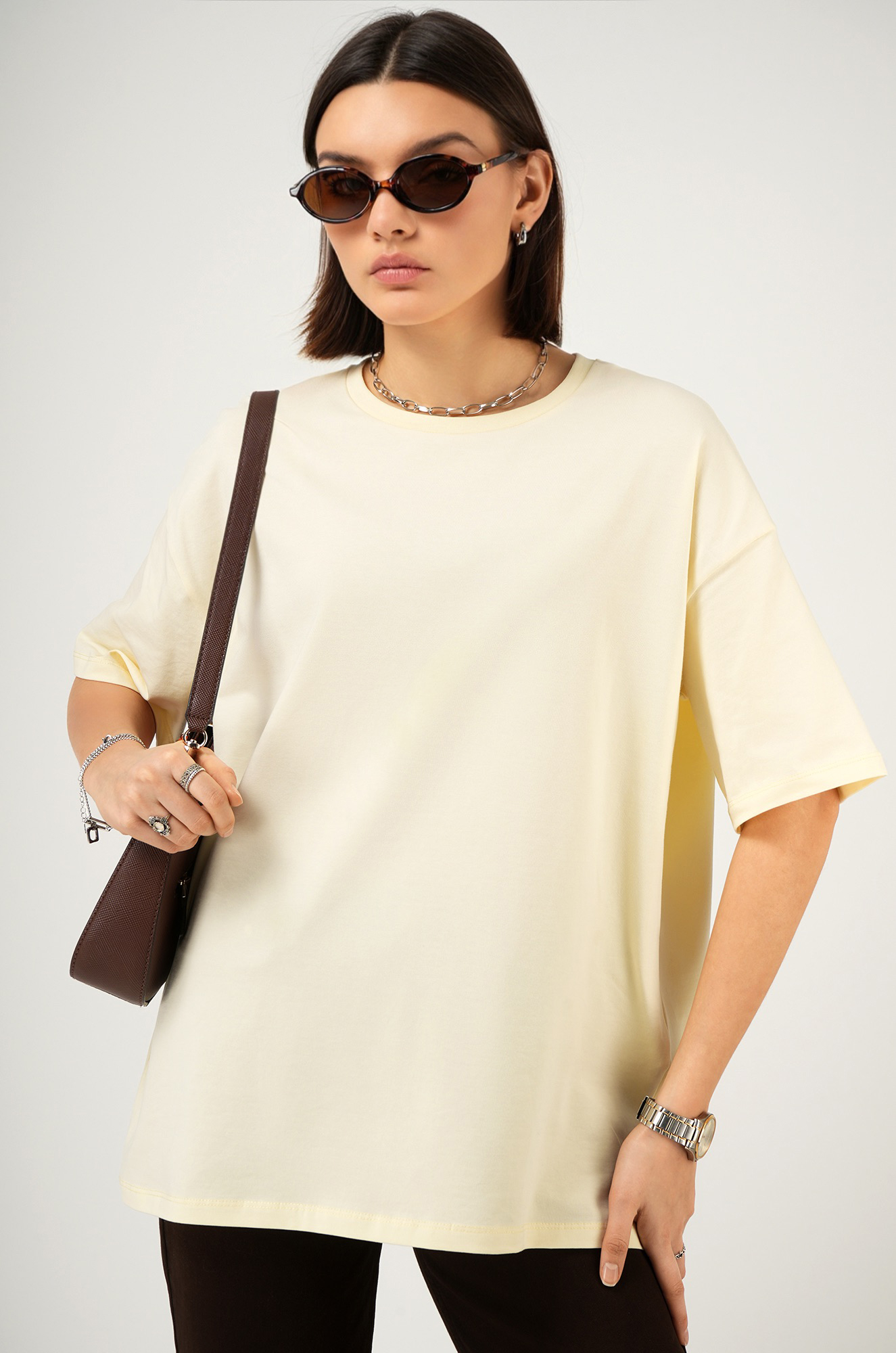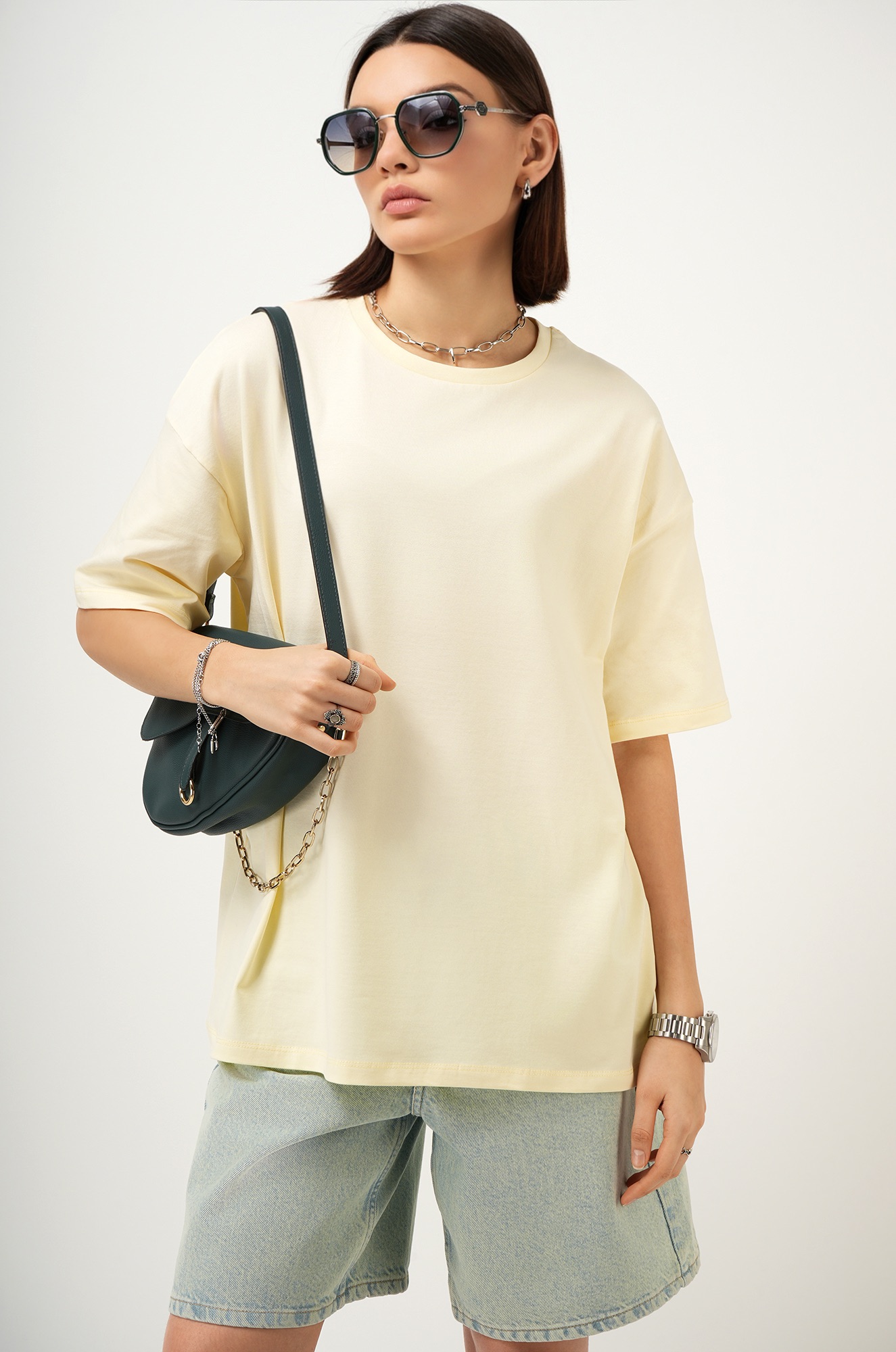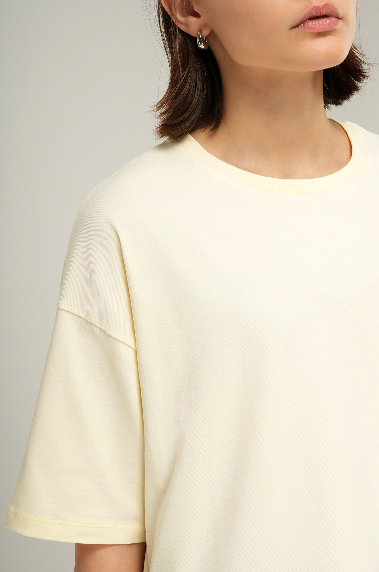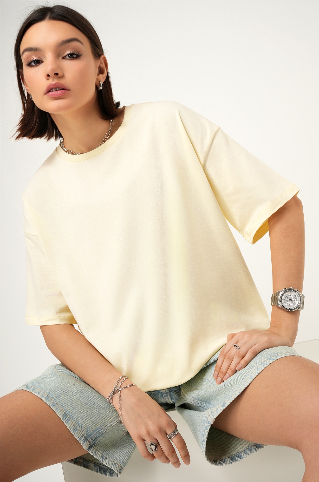 Женская футболка в стиле оверсайз — идеальная летняя база. Её свободный крой и спущенное плечо создают непринуждённый силуэт. Однотонная трикотажная модель с круглым вырезом выглядит стильно и современно.