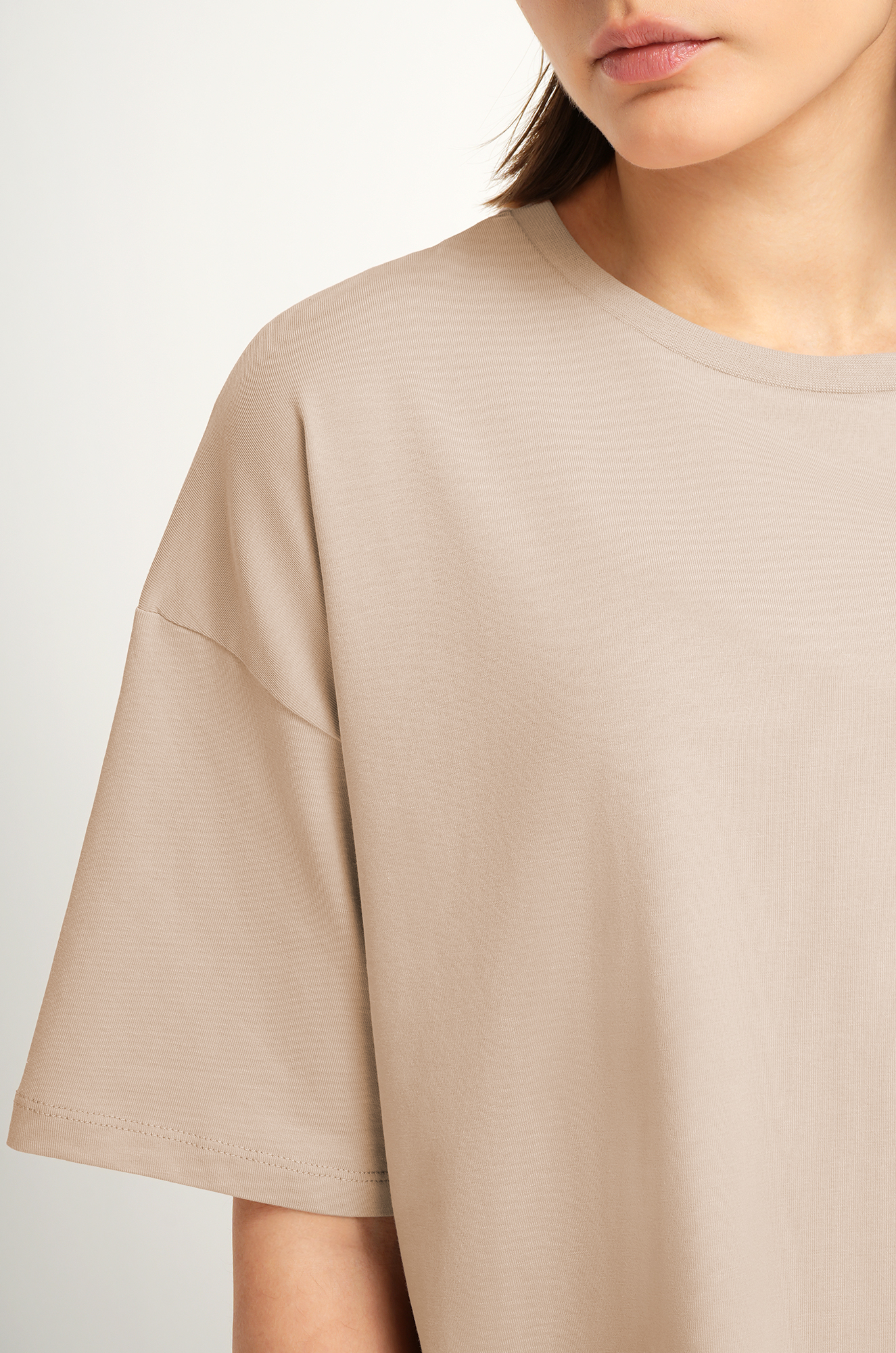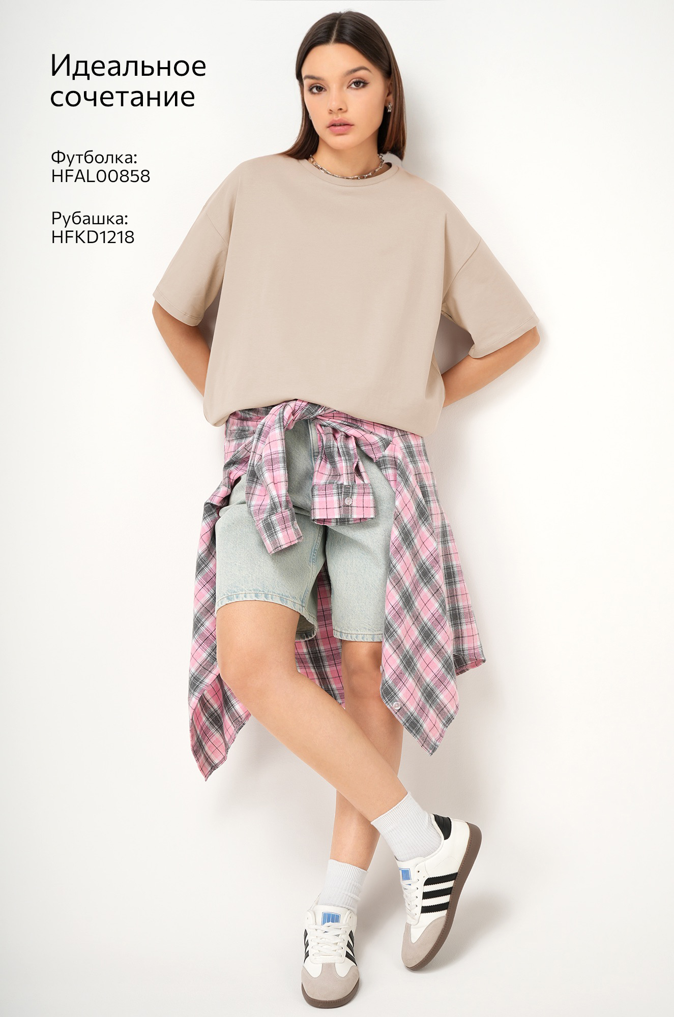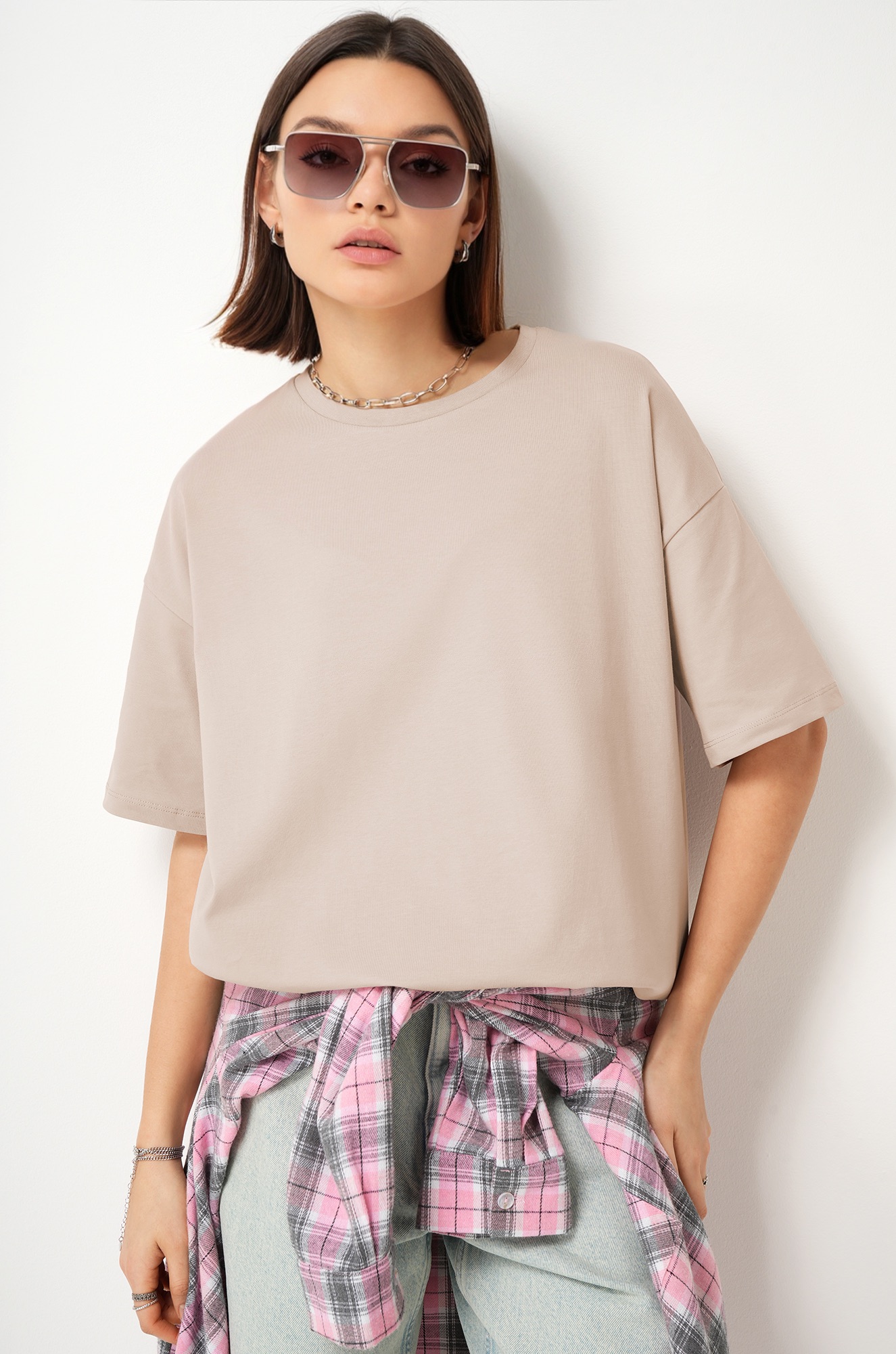 Женская футболка в стиле оверсайз — идеальная летняя база. Её свободный крой и спущенное плечо создают непринуждённый силуэт. Однотонная трикотажная модель с круглым вырезом выглядит стильно и современно.