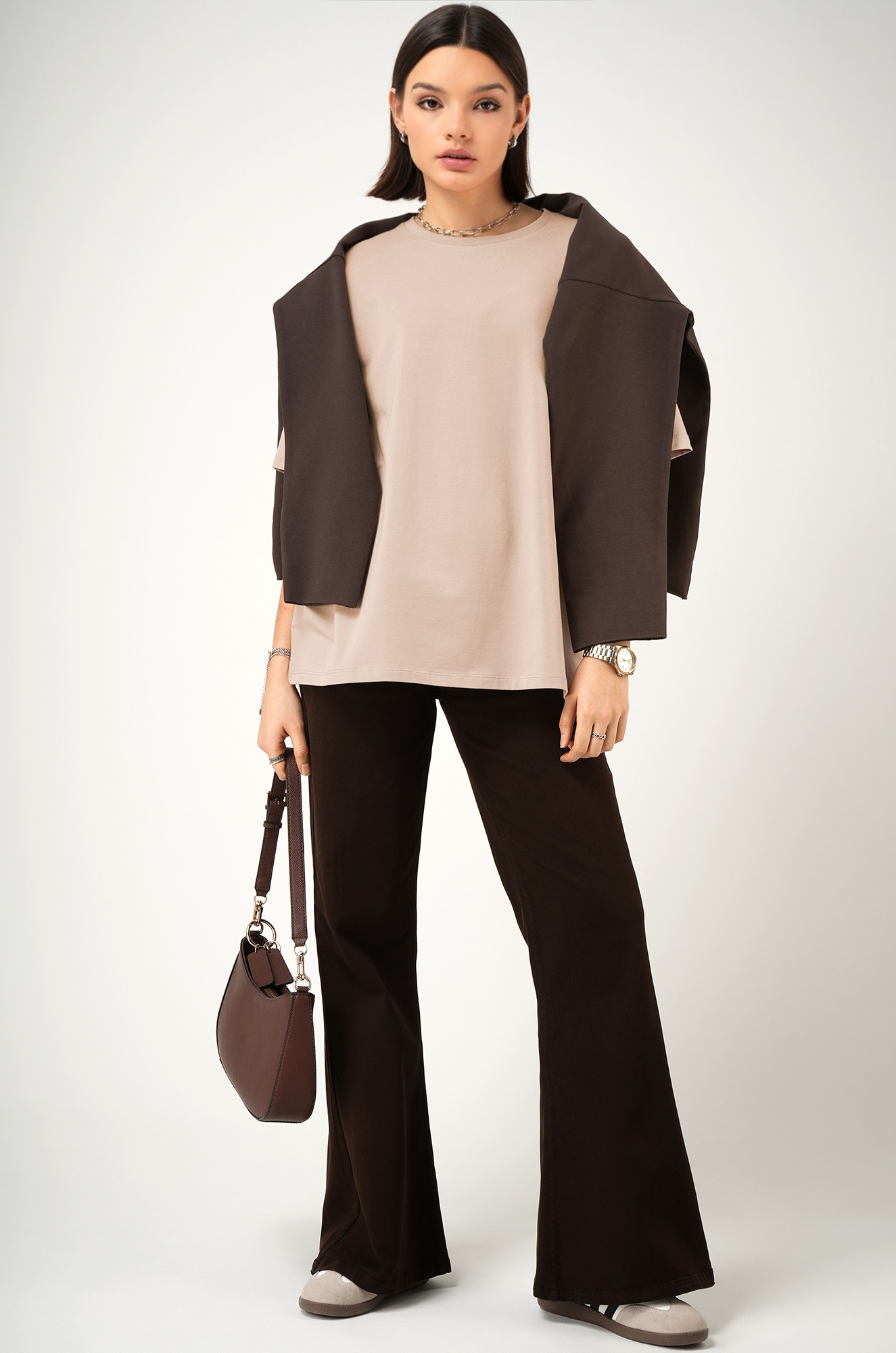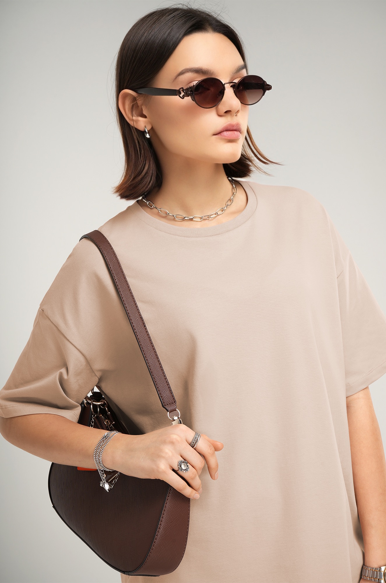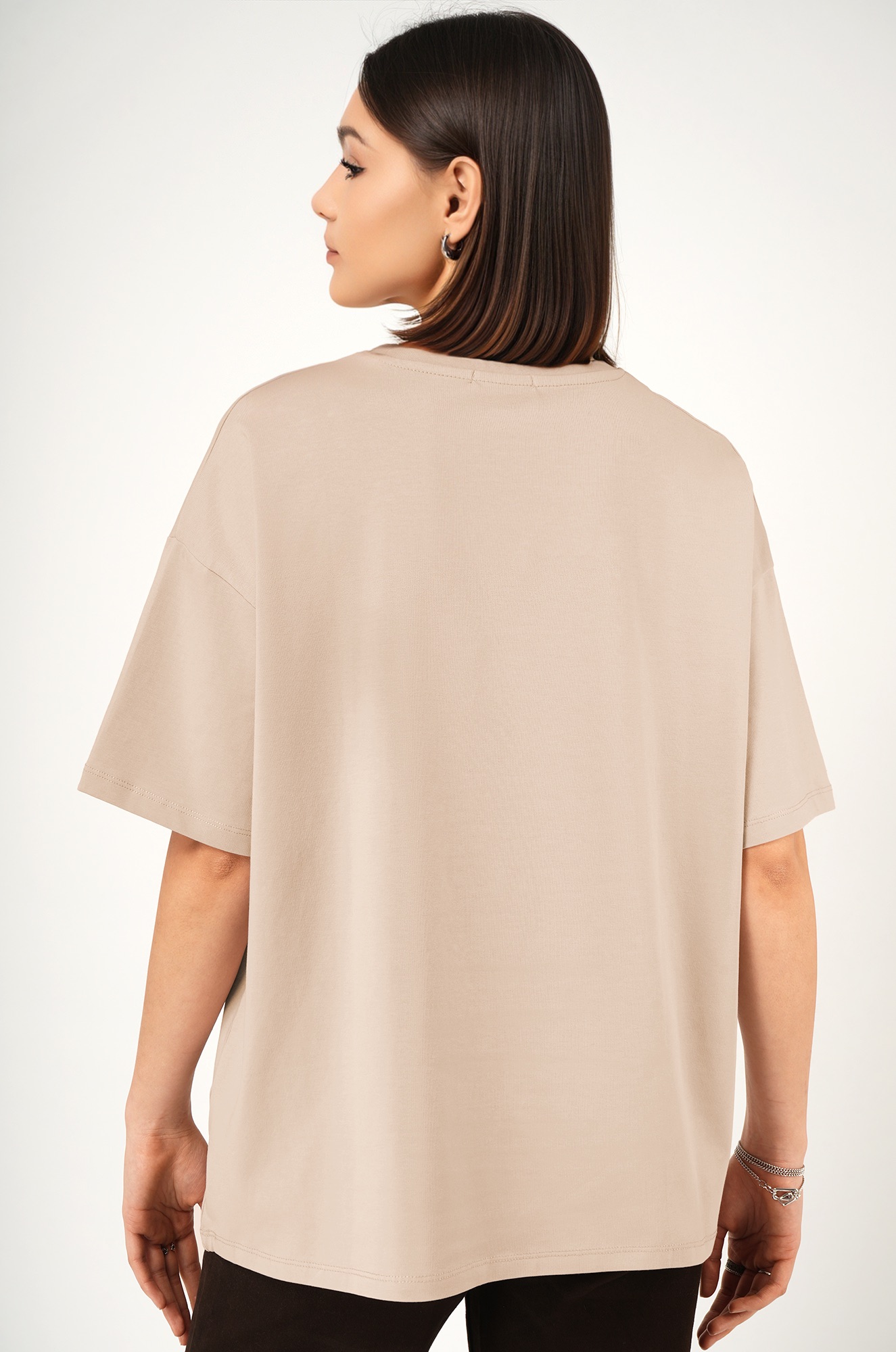 Женская футболка в стиле оверсайз — идеальная летняя база. Её свободный крой и спущенное плечо создают непринуждённый силуэт. Однотонная трикотажная модель с круглым вырезом выглядит стильно и современно.